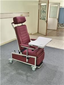 Poltrona multifuncional reclinável para transferência de pacientes com mesa frontal e rodízios, certificada pela CE e ISO.